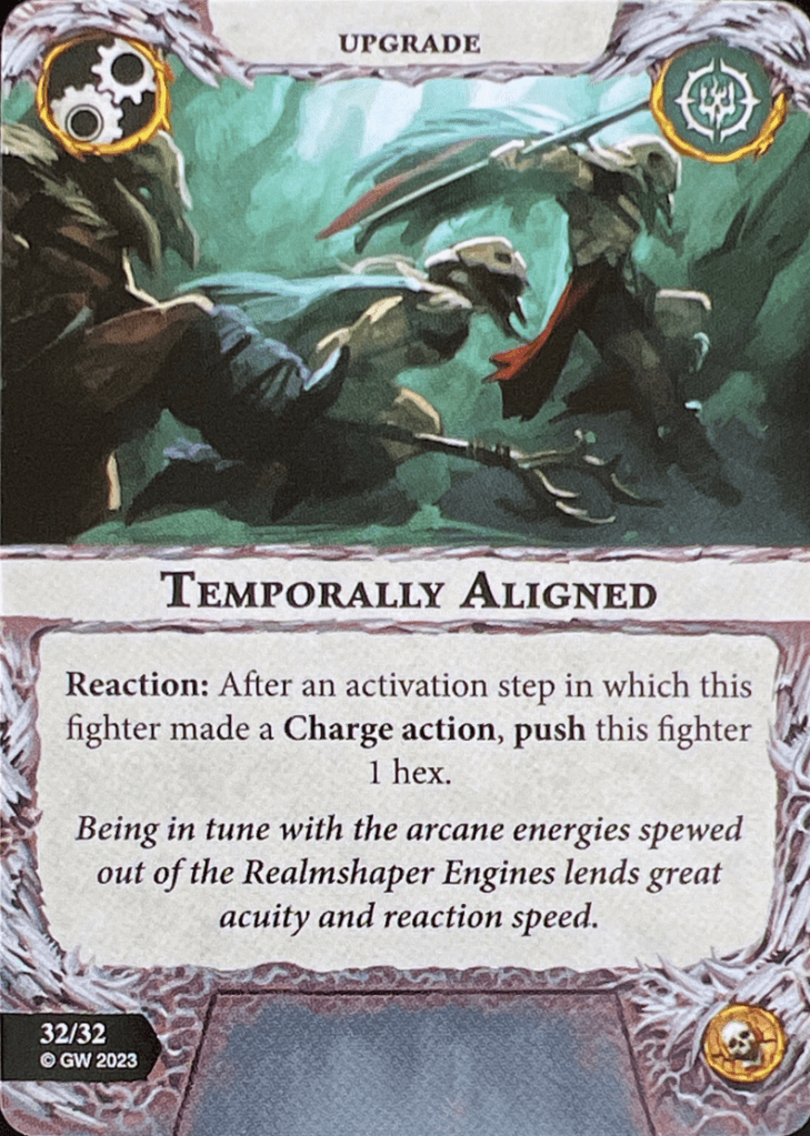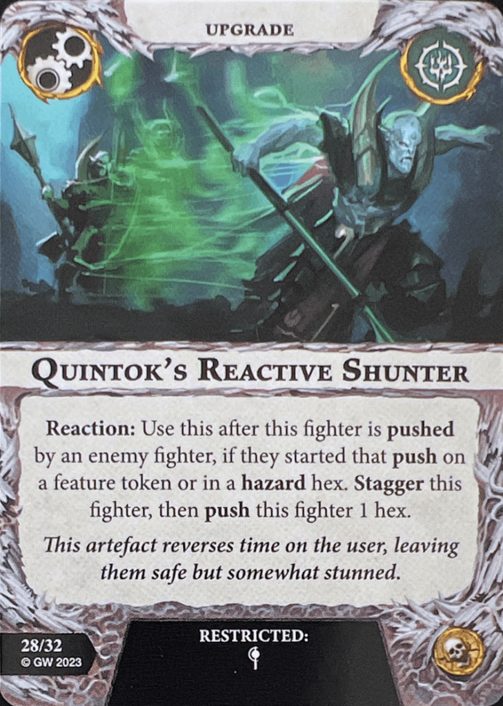 Quintok’s Reactive Shunter – A counter-push. After you’re pushed by an enemy, if you started on a feature/hazard hex, you can stagger yourself and push yourself. This is really good to become immune to drive backs and pushes in general if you need to stand somewhere, or you can use it as a way to sneakily hop away after an enemy fighter pushed you off a hazard/feature hex, thinking you will push back on, and instead push the other way! Unfortunately, the stagger debuff can be bad, especially early in the round, so Darkwater Anchor seems to be better here. Also, this is restricted to wizards, unlike Darkwater Anchor.