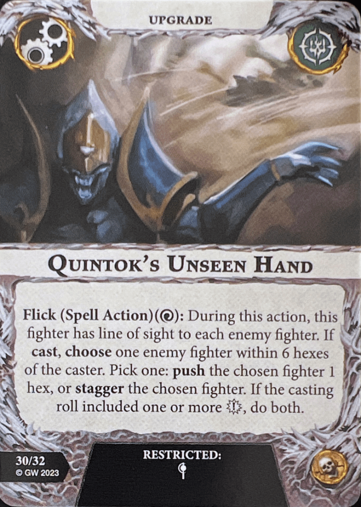 Quintok’s Unseen Hand – A spell action cast on one swirly. It lets you push or stagger an enemy within 6 hexes, ignoring line of sight! If you roll a crit, it lets you do both. This is a really nice alternative to Distraction, the only issue being that it’s an action (but as a gambit spell it might be too strong). Overall, if you desperately hate enemies coming close to you or fear the enemy staying too far (or just want to stagger), run this. However, I can’t see someone using more than one time per round because using multiple activations on it might seem wasteful.