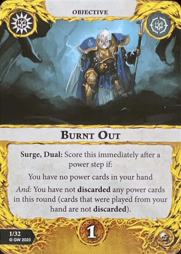 Burnt Out – A non-wizard surge for 1 glory, scored when you have no power cards in your hand and you didn’t discard any in this phase. This is really nice for any build in late game since you often end up with an empty power hand. A downside of this is that you cannot Salvage as that discards a card which would forfeit the second condition. Overall, I can see this being used in control/sit at the back of the board builds, but aggro and Hold Objective will generally have more better surges available. It’s not a bad card, just uninteractive and potentially hindering.