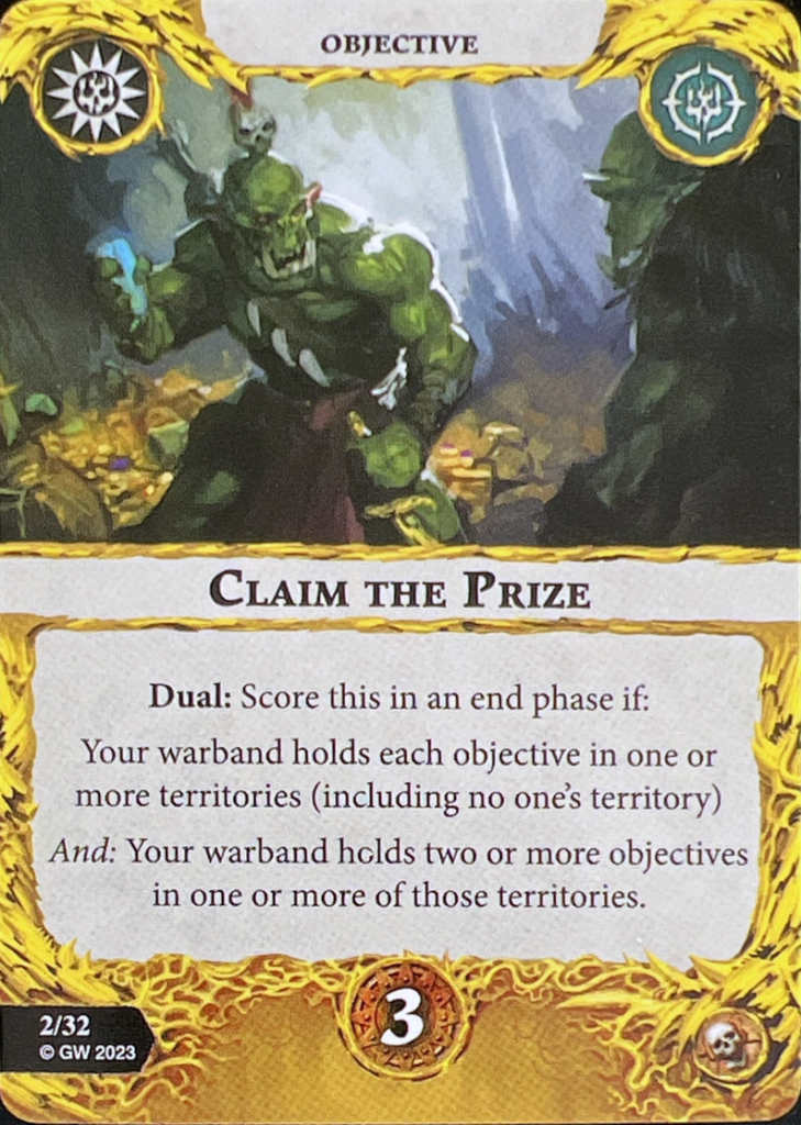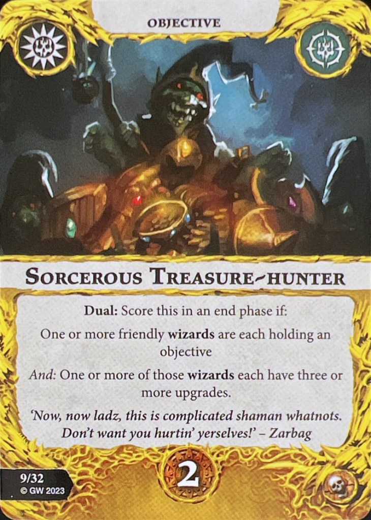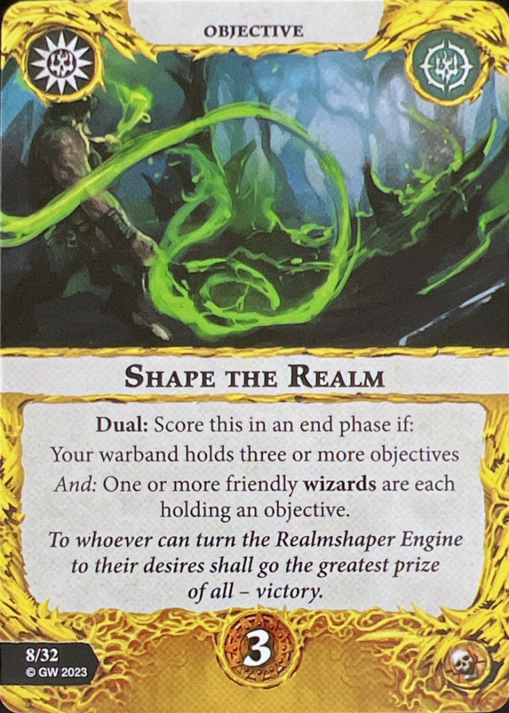 Shape the Realm – Supremacy, but you need a wizard holding an objective as well. Many warbands can make this work (like Zarbag’s Gitz), but by running this card, you are basically locking yourself into a Hold Objective-control type of playstyle, meaning you HAVE to stay on tokens, or else you will lose. Still, this seems like a decent card, just easily deniable. If only another card wasn’t printed in this same set that overshadows this one in almost every way (Claim the Prize).
