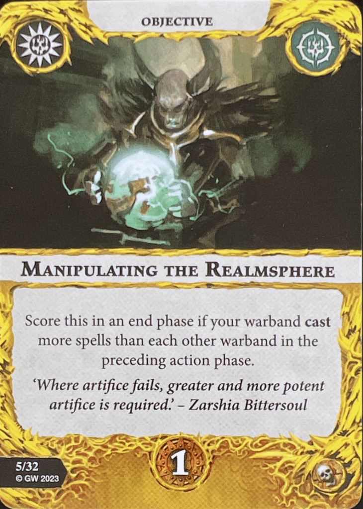 Manipulating the Realmsphere – Another nice wizard objective, 1 glory for casting more spells than others in the preceding action phase. This is pretty good if you are investing in spells considering that there aren’t a lot of warbands with a wizard, and most of them only use that wizard for 1-2 gambit spells anyway. This means that it’s pretty likely that just casting 1 spell would give you this! Playing against a spell warband would make this harder but not un-doable. Matchup dependent, but is basically free glory in the right one.