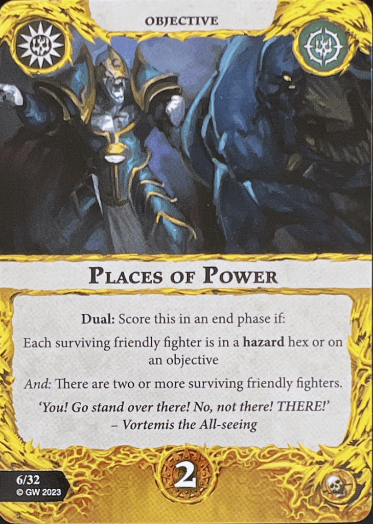 Places of Power – Literally Cryptic Clues, but with worse card art. You score it for having each surviving friendly fighter in a hazard hex or feature token. It’s a standard Hold Objective (or something like that) card, and is pretty good for elite 4 fighter warbands as well. Aggro warbands who need to kill and 6+ fighter warbands will have issues with it, but generally I think this is a solid card, just like Cryptic Clues!