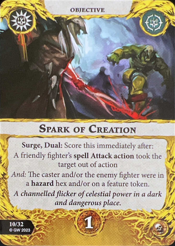 Spark of Creation – Kill an enemy fighter with a spell attack, and either them or you had to be on a hazard hex/feature token. A lot of wizards don’t have spell attacks, and even fewer warbands have more than one wizard with a spell attack. A major issue with this is that you have to be on a specific hex to do it, meaning you will probably either have to charge (meaning only 1 chance to hit the attack and kill) or have a low HP enemy position themselves nicely. A lot of things have to go right to score this, and the reward probably doesn’t justify it.