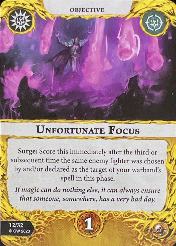 Unfortunate Focus – Have a third or subsequent spell target the same enemy in a round. The bonus – if your warband has multiple spell casters (Pandaemonium, Stormcoven) then this becomes a pretty easy card. The downsides – not a lot of warbands have a lot of spell casters, and you might accidentally kill the guy you are targeting down with a spell attack while trying to score this. Overall, a nice compensation if you keep missing a crucial spell on someone but requires heavy gambit spell investment to score consistently.