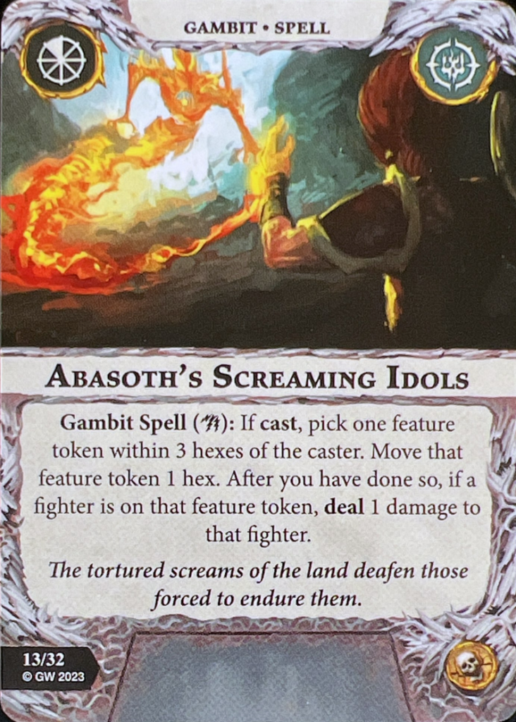 Abasoth’s Screaming Idols – Abasoth returns with a new gambit spell! Casting on one lightning bolt, this allows you to move a feature token within 3 hexes of the caster into an adjacent hex. Then, if ANYONE is on it, they take 1 damage. This can be used in 3 ways – as a ping, as a denial card, or as a desperate attempt to score a ‘stand on a feature token’ objective. This card has lots of uses and is easy to cast, so I see this getting used a lot by wizards!