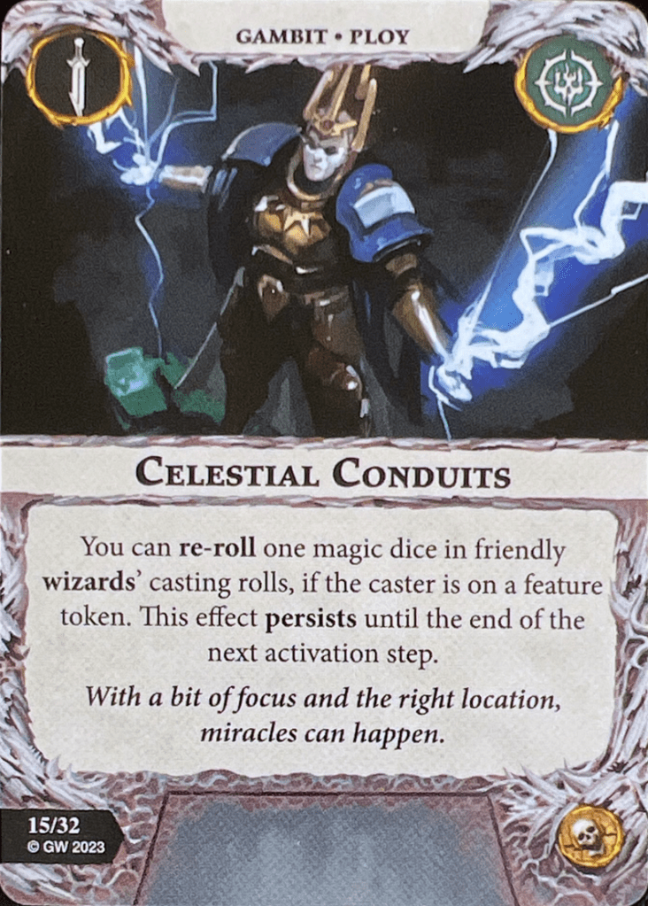 Celestial Conduits – This lets your wizards (plural) re-roll one dice in casting rolls while they are on a feature token, persisting till the next power step. This is a great card for warbands setting up spell combos (like Domitan can do since all of them can be level 2 wizards) and is also a nice accuracy buff for spell attacks! A downside is it only works on people on a feature token, so you need to be properly positioned. If you plan to stand on tokens anyway and have a wizard who needs to cast a bunch, use this!
