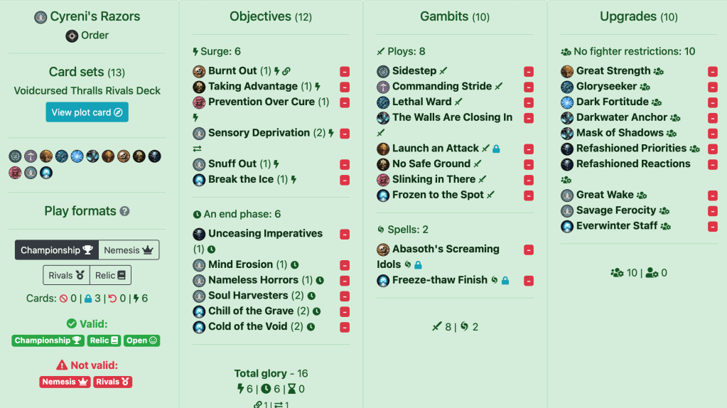 Unceasing Imperatives – A relatively easy card provided you don’t get your Voidcursed fighter (who should be a Thrall) killed. Your opponent can also score it for you, which is nice. It doesn’t require much positioning too.