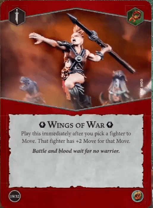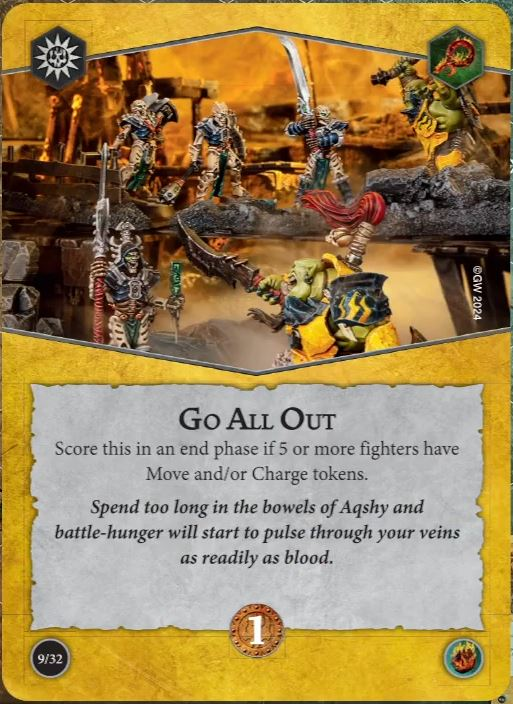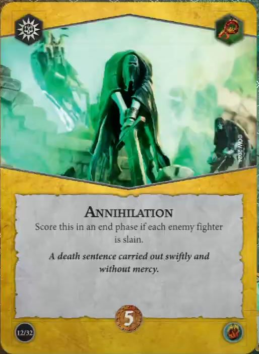Go All Out: This card is kind of weird. You need 5 fighters to have moved/charged in the action phase. This is weird in a aggro deck as you need at least 1 enemy alive to score this card (or have an alternate way to distribute move/charge tokens) and aggro typically wants to kill things… like this card is in the same deck as Annihilation. In Round 1 this is a very good end phase, but later onwards it gets very difficult.