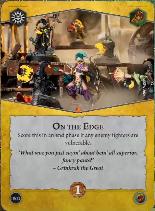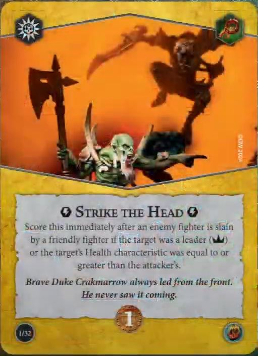 Strike the Head: Super interesting – a kill surge for killing a leader or someone with a wounds count greater than yours. It actually does force you to think about the order you kill your targets in, but compared to the other surges in this deck it’s pretty underwhelming as it actually requires tactical thinking.