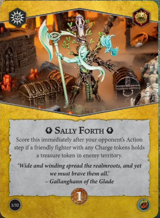 Sally Forth: Our first surge is… make a charge action. All you need to do is hold an objective with a charge token in enemy territory. There is counterplay though, as it is scored after an opponent’s activation. This does make this card quite a bit harder but for balance it’s probably healthier this way. Still, it wouldn’t be too bad if scored after any activation.