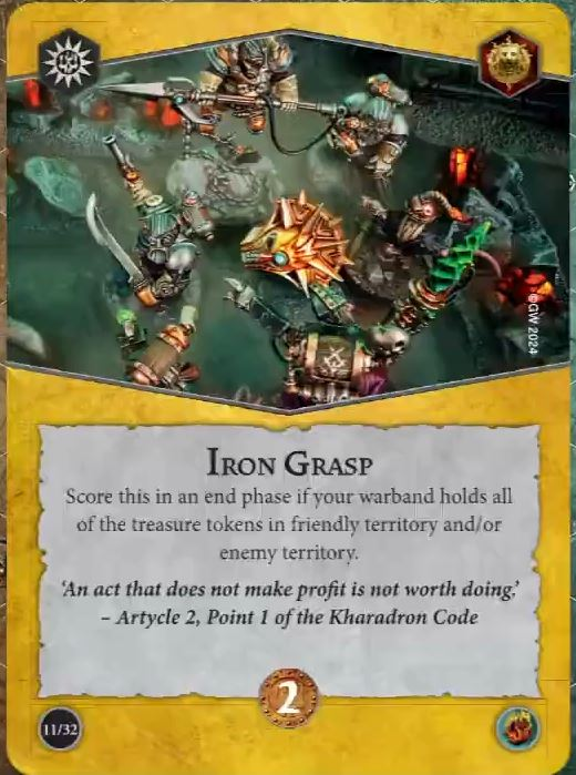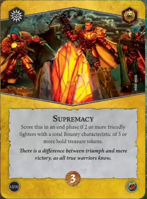 Supremacy: It’s back but not similar to the other one. It still gives 3 glory, and is the highest glory-giving objective (Annihilation doesn’t count) that we have seen so far. It’s scored if you have 2 or more fighters hold objectives, and those fighter’s Bounty adds up to at least 3. This is a very well designed card. It’s easier for some warbands than others for sure.