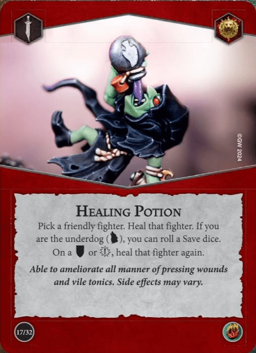 Healing Potion: It’s back and using a new mechanic: Underdog. It has a chance to be more effective if you have less glory than an opponent. Overall pretty nice, a little weaker than the old Healing Potion but still playable especially in an aggro deck.