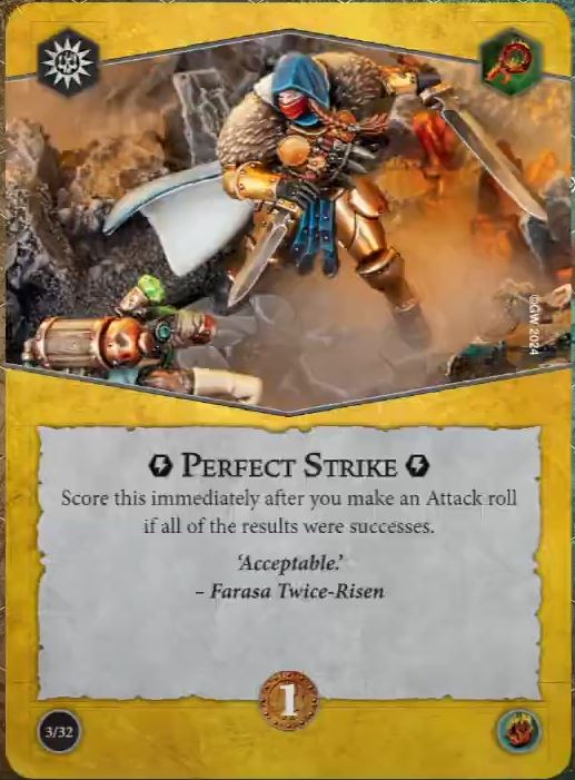 Perfect Strike: More surges for rolling dice. The attack doesn’t have to connect as well. I’d say this is the hardest of the ones we’ve seen yet, but is still a decent surge for warband with lots of low dice count attacks.