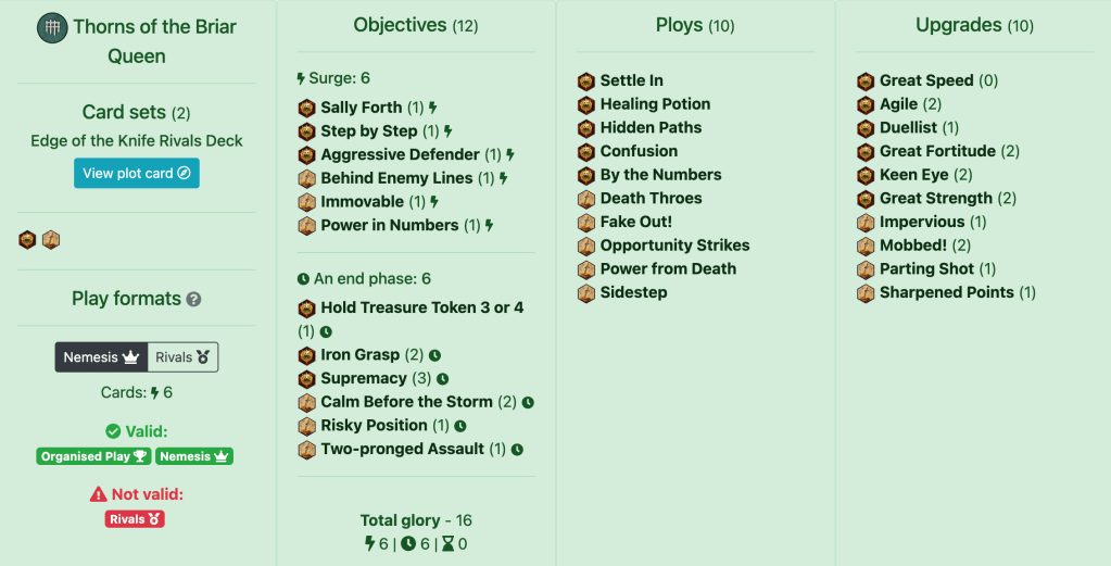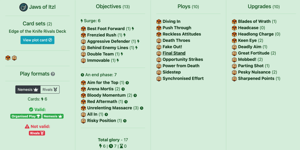Basically, I will be providing examples of decks that you can use for certain warbands or rivals decks. Today, I will focus on the new Edge of the Knife deck.