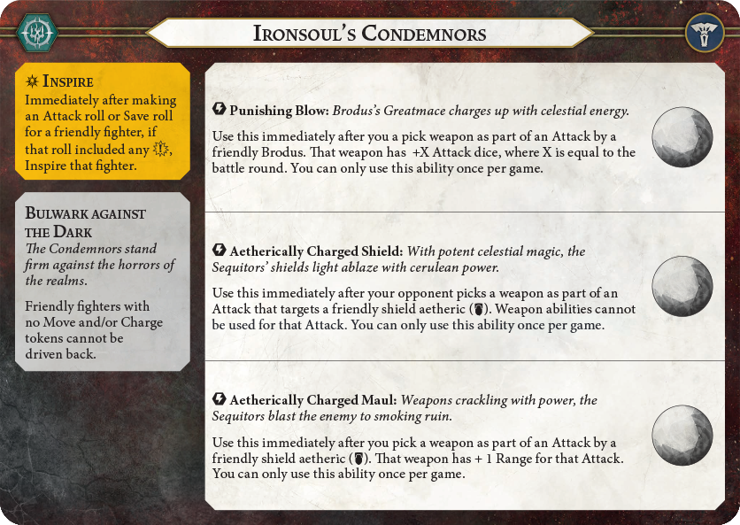 Aetherically Charged Maul: +1 range to an attack. Solid ability for a warband that charges out on activation 3. If you get driven back and the enemy doesn’t overrun you can lob a cheeky attack back at them in activation 4 from 2 hexes away.