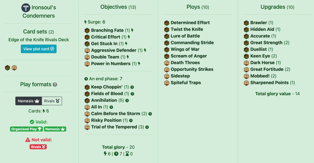 A note on Running Riot. A lot of people were asking at the event if I was using this to temper a fighter and the answer is no. It needs at least one other fighter to be tempered to use it. Which means you now need two cards to make it work (Riot + Dark Horse/Scream) AND a successful attack. In an elite build, it’s just hard to justify the space when ploy space is at so much of a premium already.