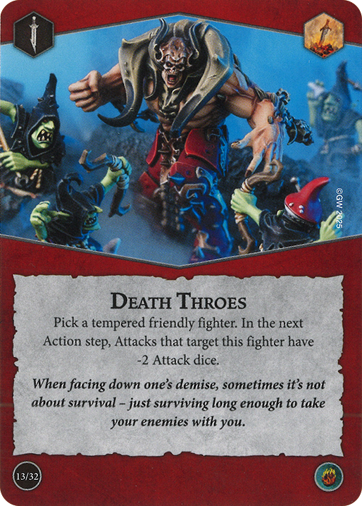 Death Throes – This is a very solid defensive card. -2 attack dice when attacking a tempered fighter. If your opponent is trying to focus down 1 fighter at a time this is a huge speed bump to get over.