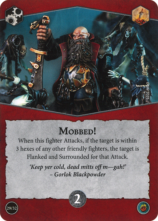 Mobbed! – Is incredibly powerful. It doesn’t specifically say melee (more on this in round 3). It makes a 3 dice attack “anything but swords” and INCREDIBLY accurate. On the new “smaller” board there are not many instances where it’s not getting used multiple times a game.