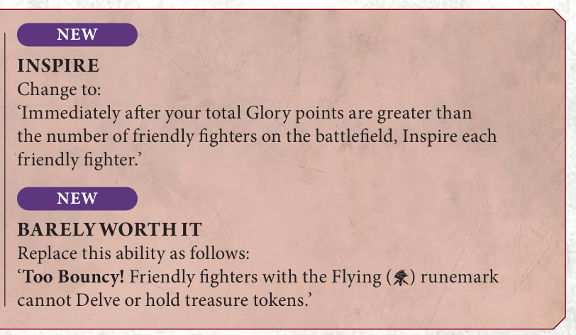 This is what we all came here for! The Zarbag nerfs now make them harder to inspire by requiring MORE glory than fighters instead of more/equal to. Also, their ability that prevented them from giving 9 bounty is gone and replaced with a ban on the squigs from Delving/holding.
