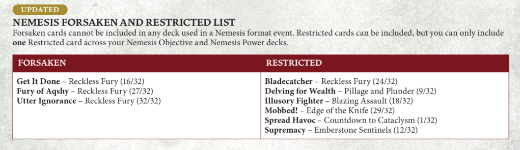 - Delving for Wealth is restricted for obvious reasons. My main gripe with this is it’s the ONLY card in PnP that’s restricted which makes no sense as Broken Prospects is still super free two glory and half the surges are still busted.