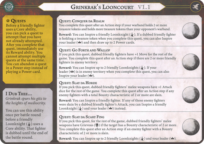 - The first quest, Conquer da Realm, doesn’t give anything upon accepting it. You complete after an action step if you hold two tokens, and if your opponent holds less tokens than you. Once you complete this quest, your reward is that you get to inspire a Loonknight. However, if one of your two holders was your Dubbed fighter, you get a bonus – you get to inspire Grinkrak (specifically) as well as draw two power cards.