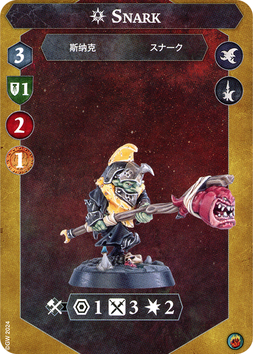 Now it’s time for Snark. Snark is a glass cannon, having the last two damage attack in the warband while also being two health. His weakness is his lack of defense when inspired and just in general. This makes me enjoy him more as a late game piece, as he is usually the last two damage guy standing. Other fighters want to inspire first in a passive plan in order to prevent their deaths, while in aggro plans Snark is a good choice for an early inspire for his extra accuracy. He is also a prime dub target as it makes him very scary for one attack – which is usually all he gets. Overall, Snark fills a similar role to Grinkrak – a fire and forget missile. Contrary to Grinkrak, he is not as accurate. I prefer deploying him near the back, as that means he can actually get some late game value.