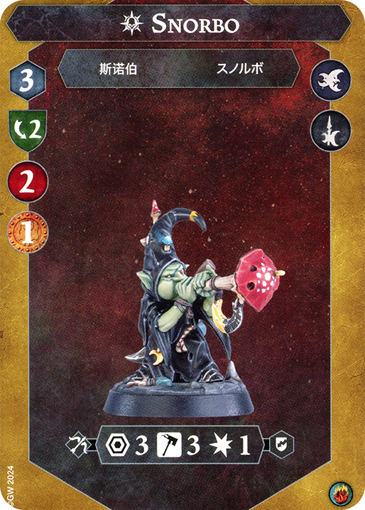 Now for Snorbo. Snorbo occupies an interesting niche of ‘most accurate yet painless’ fighter in the warband. He doesn’t do meaningful damage but he hits almost any attack, and notably, staggers. He is very frail and has the second worse Save characteristic in the warband when inspired (though it is still pretty good). He almost always is the farthest most piece for me, as his Range allows him to damage opponents from safe positions while his three move allows him to take some decent token control. Something to keep in mind is Snorbo cannot benefit from the dice/damage buff of the dub without upgrades, making him slightly weaker in late game especially in an aggro deck. Inspiration wise, Snorbo is usually one of my last guys because while his accuracy gain is notable, his reliable one damage isn’t very useful contrary to other Loonknight’s Two Shields or Damage.