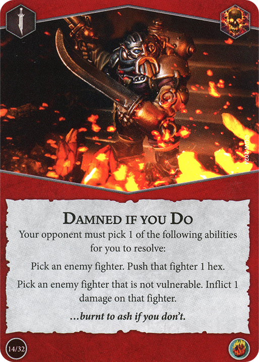 Damned if you Do – The card itself is genuinely great. The ping part, on paper, not so much. It can’t kill which is bad and you can literally say ‘no’ to it, which makes people consider it bad. The reason it’s so high up is because a lot of the time, if you play this card, you probably have a cheeky plan up your sleeve to displace the opponent, so often times opponents actually do say ‘ping me’. The ping part of the card conveniently has infinite range and no way to dodge. This makes it one of the highest skill ceiling pings in the game. While it cannot kill, which is a massive caveat keeping it from S-Tier, the fact that it is literally unavoidable damage if played properly is kind of huge. It does require expert skill to use properly and against certain warbands it’s pretty bad because they might not care about getting pushed. In the wrong hands, it’s B or even C Tier, but in the right hands, we can safely say A Tier.