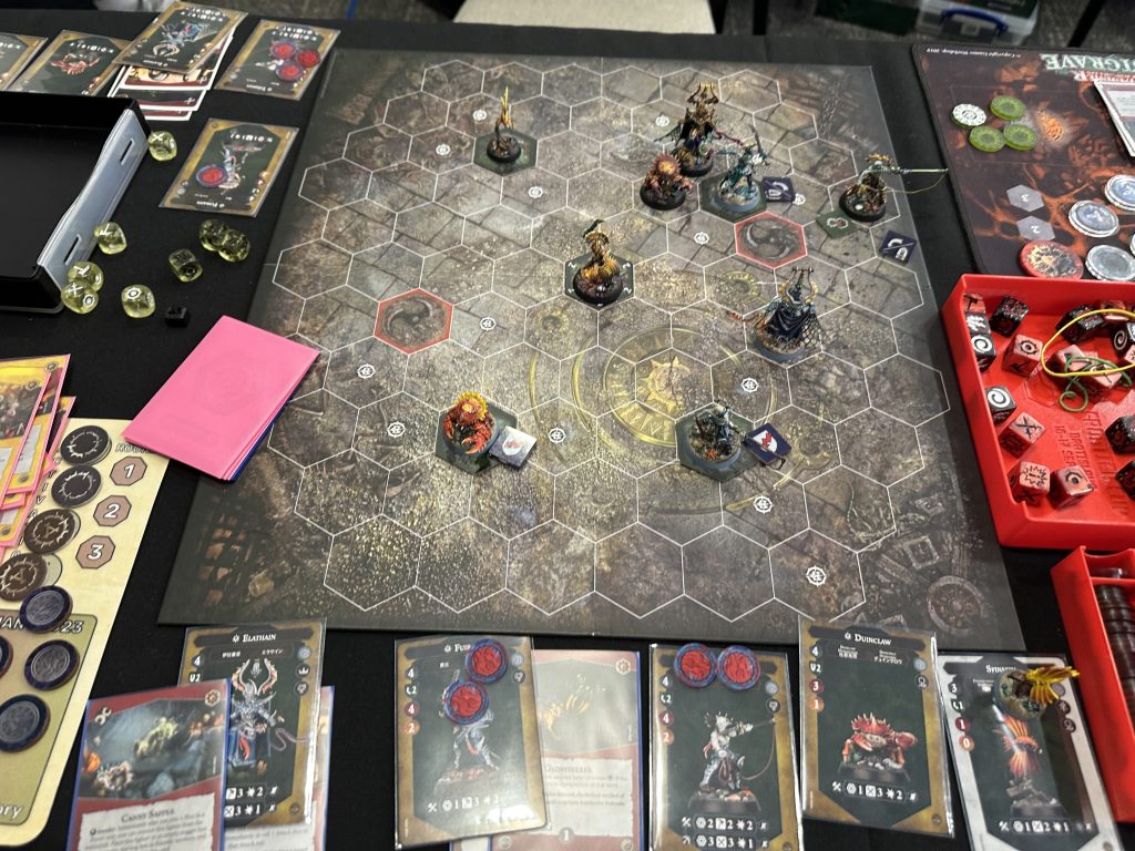 With high tide rising, the Soulraid was ready to strike. Tammael charged onto a Waystone, but his lack of sight lessened it’s effect on him, and he missed his killing blow onto Kheira. Gorl, who turned away for a split second to look at what happened behind him, was swiftly killed by Furiann, who triggered a Trap on the Cache she was standing and then struck Gorl down with a Gloryseeking strike. “Die, crab!” Sarakkar kept swinging into Duinclaw, whose carapace was nigh-inpenetrable. Duinclaw was doing his best to scuttle away, and was getting away with it! As the high tide reached it’s end, Elathain’s Soulnet flew from the shadows to latch onto Kheira, relieving her of her soul. Neither warband was letting the other one Strip the Realm.