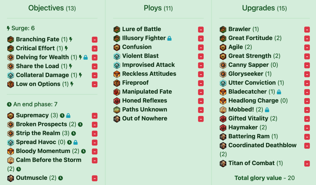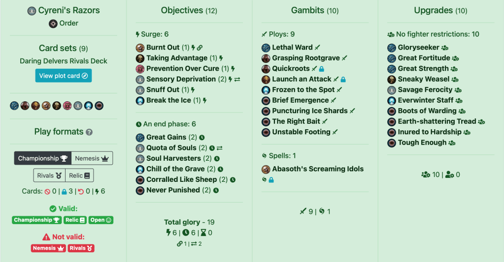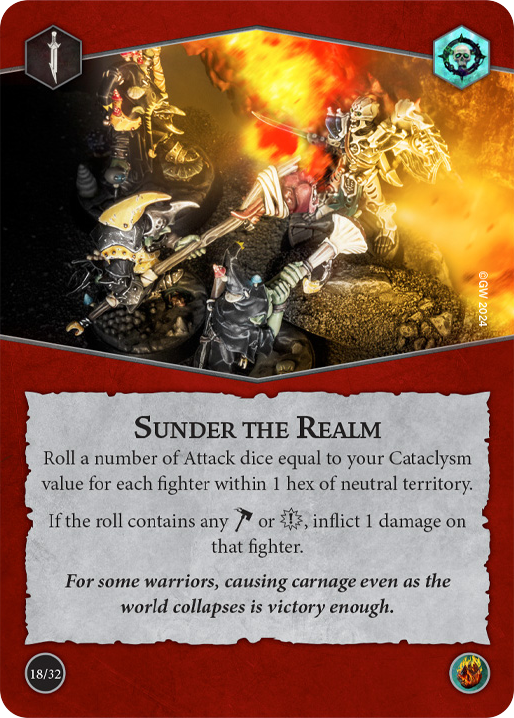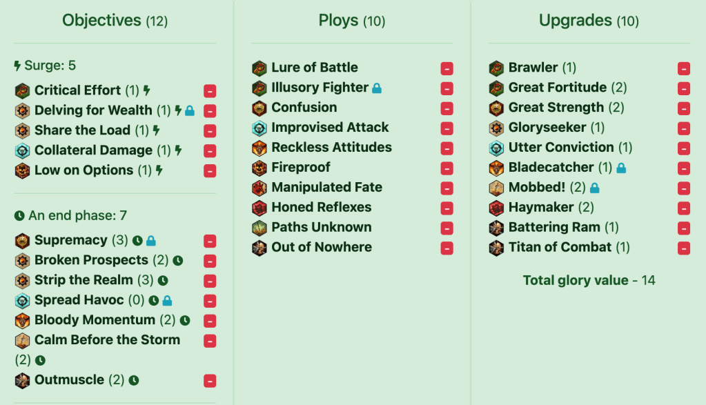 The ploys are mostly the “staples” of the deck, cards that currently you would need a very good reason not to just immediately include. Confusion in Emberstone Sentinels, Illusory Fighter in Blazing Assault and Manipulated Fate in Realmstone Raiders are a couple of cards that fall into this category. Also cards that “burn” an activation (majorly decentivise your opponent from using their activation optimally), such as Reckless Attitudes, are also on this list. The two outliers of these two categories are 1) Raider’s Premonition, which is one of the stronger Emberstone ploys and the only Emberstone card to be hit, and 2) Get it Done, which would actually make Reckless Fury a “charge manipulation” deck again and I think is able to come off the forsaken list if it is restricted, but I am be ready to be proven wrong.