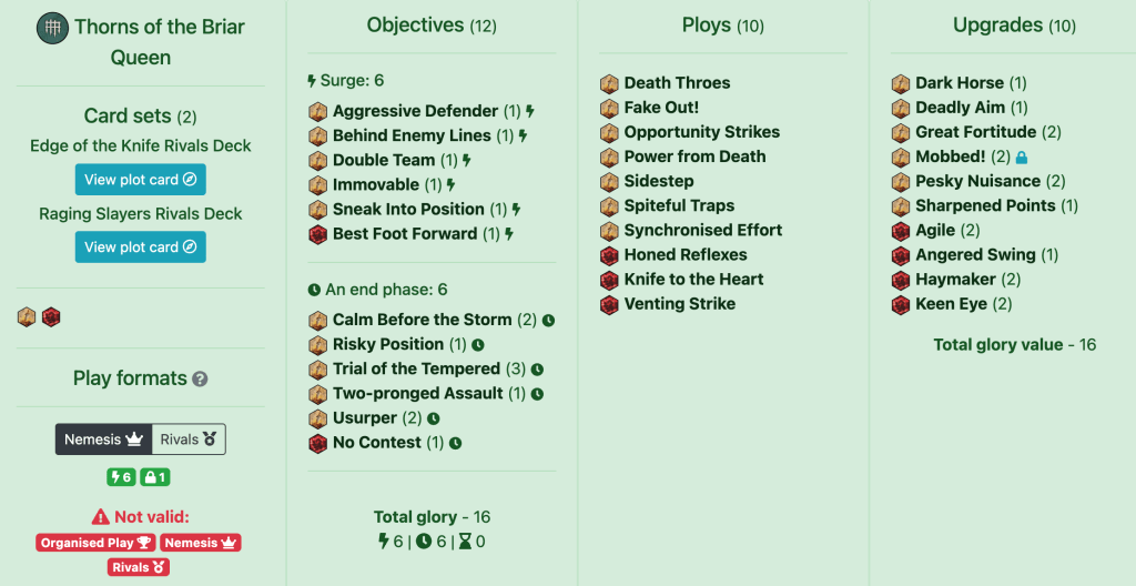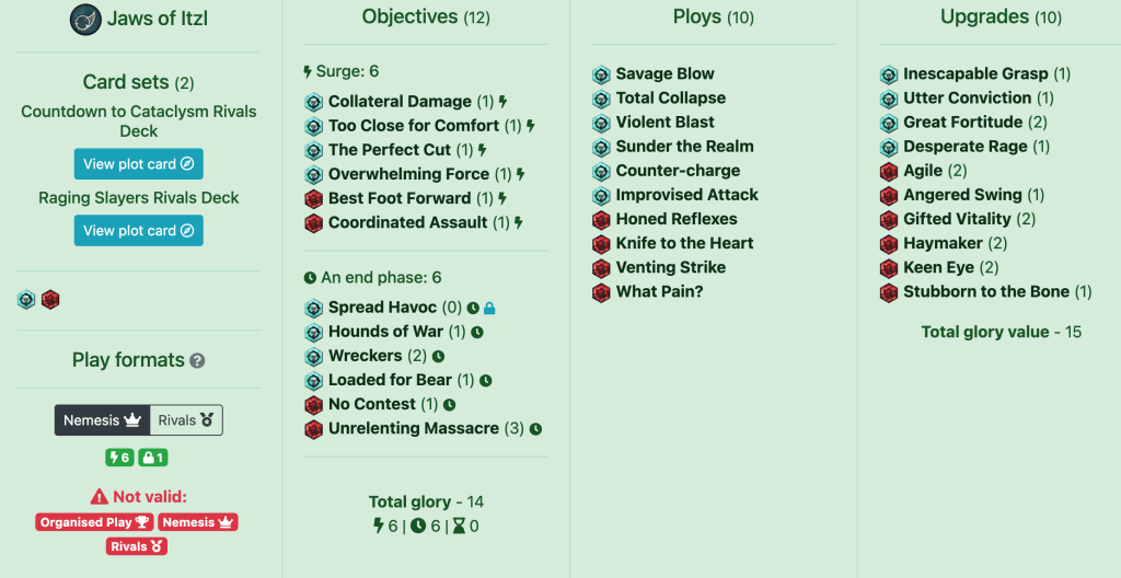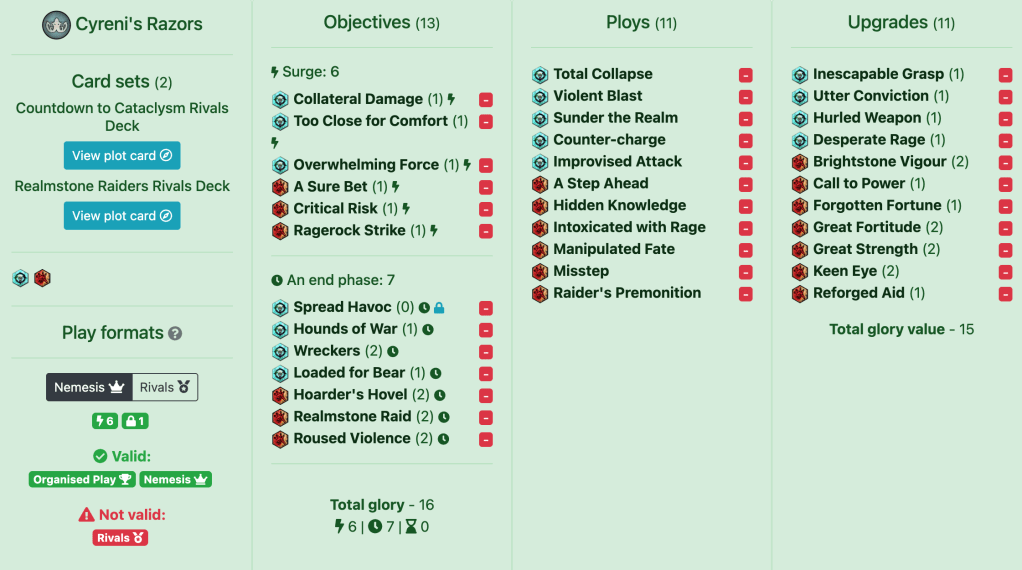 In the objectives, I want to highlight how strong Overwhelming Force and A Sure Bet are. For the Razors, both of these basically read ‘hit an attack (and get lucky)’, which is super good! Too Close for Comfort I was trying recently and it works nice, doesn’t need dice unlike The Perfect Cut, which I skipped here. Critical Risk is worse Critical Effort and Ragerock Strike is worse A Sure Bet (for Cyreni) but both cards are still pretty strong, making the surges very reliable. End phases see us take Wreckers which might raise some eyebrows but I am a believer in the ‘ping plan’. If you aren’t, I recommend you take Set Explosives instead. Hoarder’s Hovel is scorable kind of easily, and Roused Violence and Realmstone Raid are both pretty easy with proper Raid mechanics. Loaded for Bear and Hounds of War (as well as Spread Havoc) are ‘autoscores’ to bump up glory count!