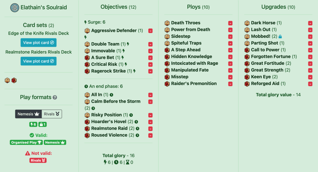 This deck despite looking very funny and unplayable might actually be very good! It’s pretty flexible and the objectives are actually pretty easy to pull off, just hit attacks (which with Soulraid is kind of a given). Additionally, countering this deck is diabolically difficult because you have so much lockdown tech on top of not really having much deniable objectives. Lockdown here even means something cause usually you are only brawling with three fighters, which means that your opponent has a lot less targets to choose from. Also super notable is the amount of card draw in this deck. We have Power From Death as well as Call to Power for 4 cards drawn each game, meaning we don’t suffer as much for having only 3 lockdown cards.