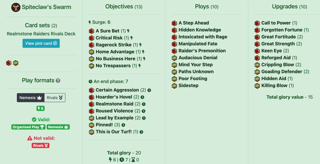 The idea here is you get to basically just play a normal game of Underworlds. Send your fighters forward, hit attacks, score stuff. We throw in a spot of lockdown tech in order to mess with enemies. It’s a lot more effective against ES/PnP or other passive stuff compared to the Spiteclaw deck but it’s also strong against RF and elites, due to Trial of the Tempered becoming fairly free against them. It suffers a little into swarms due to less raids and a single Great Fortitude messing up Trial but overall it’s pretty strong.