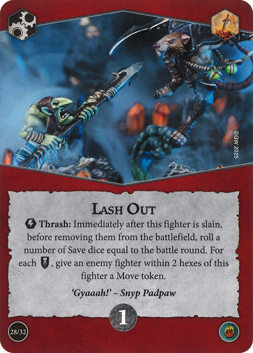 Lash Out – This can give move tokens to MANY fighters! Charge headfirst into a battalion of enemies and now you can’t get killed or else you lock them all down! (also rolling a Shield on three dice isn’t that low of a chance – about 74%!)