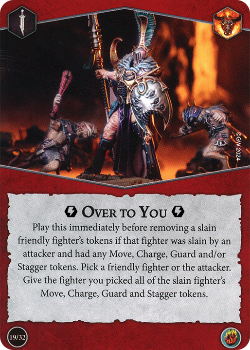 Over to You – This card requires a fighter to die AND have a move token, which makes it a little questionable to use. On top of that, it also gives your opponent a charge token which re-enables charged out. On top of THAT, if you had Guard tokens which a no-Charge playstyle would, your opponent gets them to. Also this card is in Reckless Fury, so giving a move token is actually a buff in this case. (quick note on Catch Weapon – it doesn’t give move token so we ignore it in this article)
