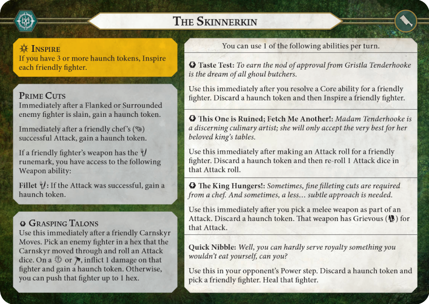 Ben: This warband is very interesting for this, as all the fighters have a one time effect when they die and inspire when any non-minion fighter is dead. In general Dhoraz should be the first to die, as he is the most threatening fighter, hitting for 3 damage, and inspires to become even more accurate, however the pushes from his death could be used to score multiple hold cards.